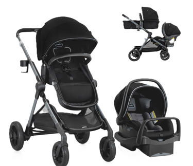 This combo starts as a single stroller and expands to double with a second seat (sold separately) — a true grow-with-me option that doesn’t break the bank. Includes an infant car seat and car seat base.